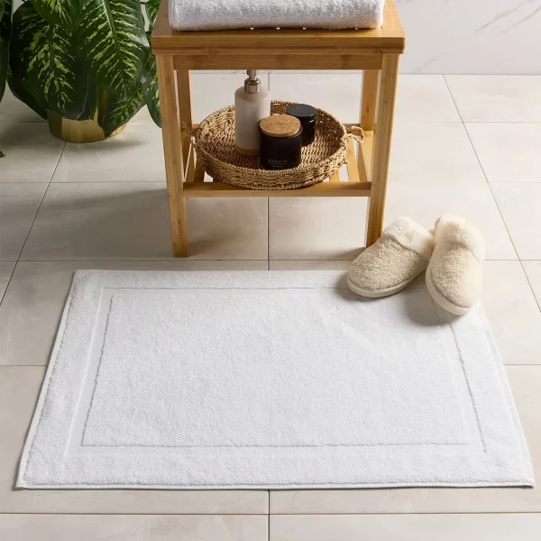 Made from high-quality 86% cotton and 14% polyester, it features a plush, absorbent texture that ensures superior water absorption and quick drying. The dense loop weave provides a soft, cushioned feel underfoot, while maintaining exceptional resilience even after repeated washes. Its elegant border design and crisp white finish add a clean, upscale aesthetic that enhances your hotel’s bathroom décor.